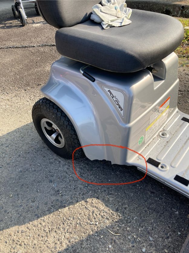 コチラの写真の赤いマーク部分をよく見るとカウルが割れています(‘Д’) 気付いたのは定期点検に訪問した時ですが、ご利用者に伺いますと一か月以上前、ブロックにぶつけた時に割れてしまっていたと仰っています💦