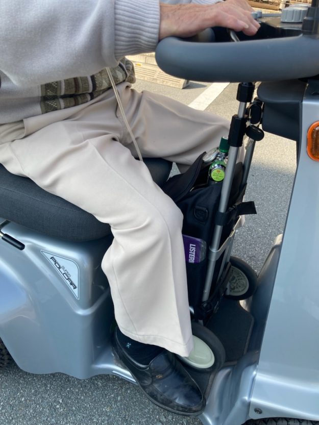 ポルカーはJIS規格(国家規格)の関係上、酸素ボンベが置ける付属品は取付けできないため、写真のように足置き場にボンベを乗せて、挟んだまま運転していただくことになります。