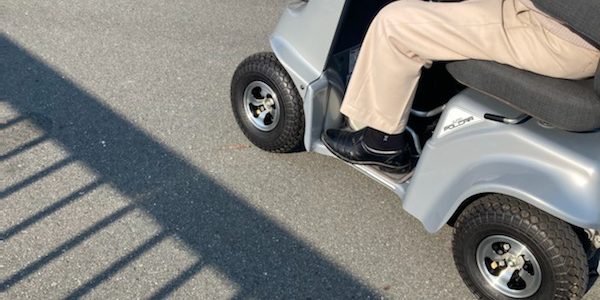 酸素ボンベ(以下:ボンベ)をご利用されているお客様のポルカー試乗でしたが、JIS規格の観点から、ポルカーではボンベ置きとして利用できる付属品がないため、足置き場にボンベを置いて運転していただくこととなりました🤭