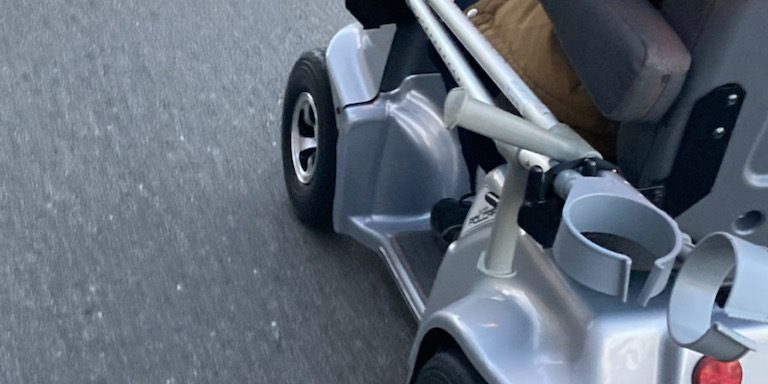 これは『松葉杖スタンド』と呼ばれるもので、車体の前方側と後方側に専用のブラケットを取付けることで、松葉杖やウォーキングステッキ(写真はロフストランド杖)のような長い杖を置くことができます。走行の邪魔にならない位置に杖を固定できるので、安心して運転できます(^.^)