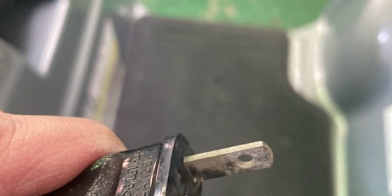 すると、写真のように充電プラグとコンセントに焦げが見られていました。